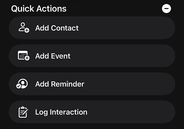 Just below the “Home” heading, we have placed buttons for adding a new contact, creating an event, adding a reminder, and logging an interaction.