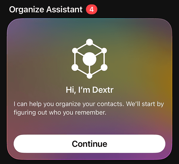 Also on the Home screen is the Dextr Context Builder, also called the Organize Assistant. This tool makes it easy to organize your contacts by asking simple questions about them. For example, the first question for all imported contacts is “Do you remember this contact?” so that Dextr only follows up on people you actually recall.