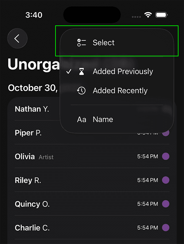 As you scroll down, you’ll see a menu button that directs to all remaining contacts you haven’t organized or answered questions about yet. This screen is ideal for making bulk edits. Tapping the menu icon in the upper right lets you select multiple contacts at once. From there, you can add or remove tags, set relationships, or archive several contacts in a single action.