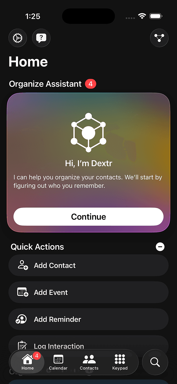 When you open the app, you’ll land on the Home screen. This is the central hub for quick actions and helpful insights about your contacts. As you use Dextr to organize your address book, this screen becomes more informative. Over time, you’ll see scheduled reminders, upcoming events, recent interactions, and other useful details.