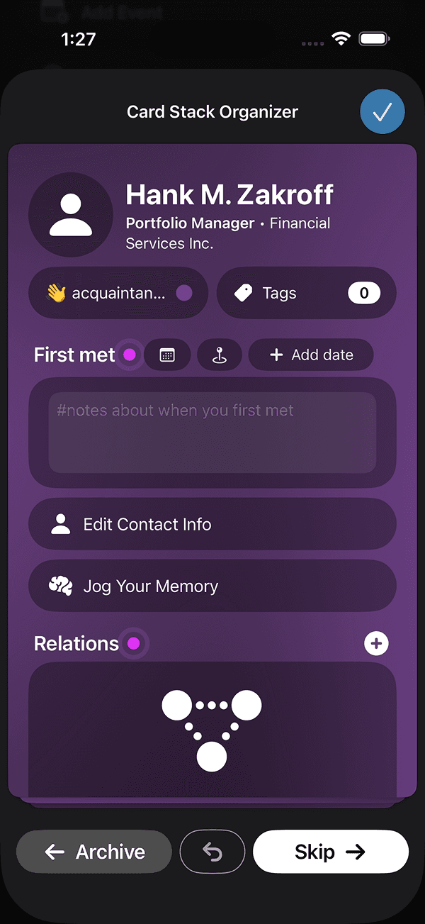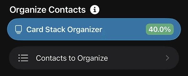 Below the Context Builder, you’ll find the Card Stack Organizer. Like the Context Builder, this tool highlights contacts with missing information. Instead of asking guided questions, it gives you a quick way to update several fields at once.